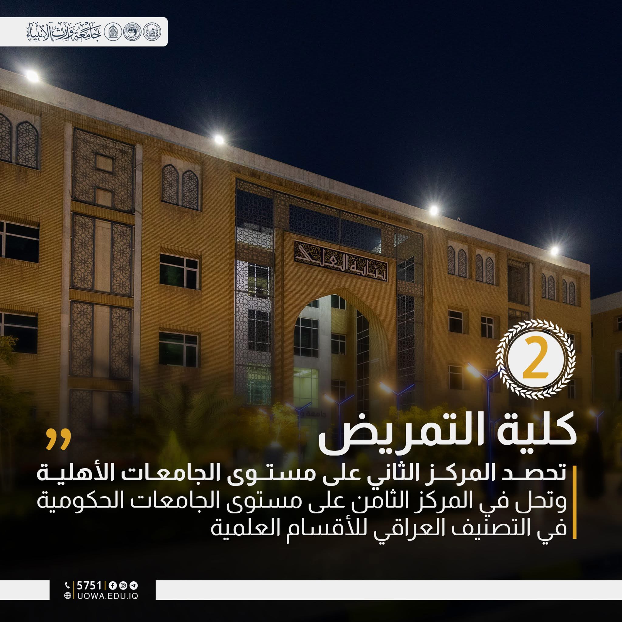 حققت كلية التمريض في جامعة وارث الأنبياء (عليه السلام) المرتبة الثانية على مستوى الجامعات الأهلية العراقية والثامنة على الجامعات الحكومية ضمن نتائج التصنيف العراقي للأقسام والكليات العلمية، في إنجاز يعكس تميّز الكلية أكاديميًا وجهود ملاكاتها التدريسية في الارتقاء بجودة التعليم