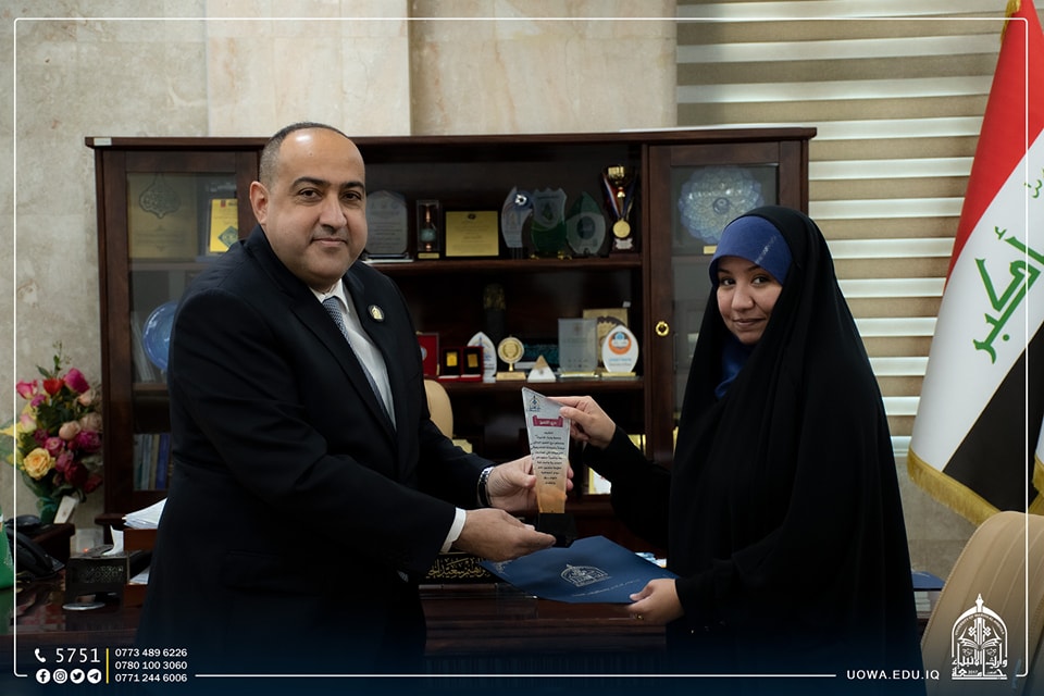 كرم رئيس الجامعة الاستاذ الدكتور ابراهيم الحياوي، باحثي الجامعة المتميزين بدرع "التميز البحثي" والشكر والتقدير للأستاذ المساعد الدكتور انمار فالح ديكان من كلية الهندسة، والاستاذ المساعد الدكتور نور الساعدي من كلية العلوم الإسلامية، والاستاذ المساعد الدكتور ضياء البناي من كلية الادارة والاقتصاد، لجهودهم العلمية والبحثية من أجل رفع سمعة الجامعة الاكاديمية سائلن الله عزوجل الموفقية لهم لخدمة المسيرة العلمية في بلدنا العزيز.