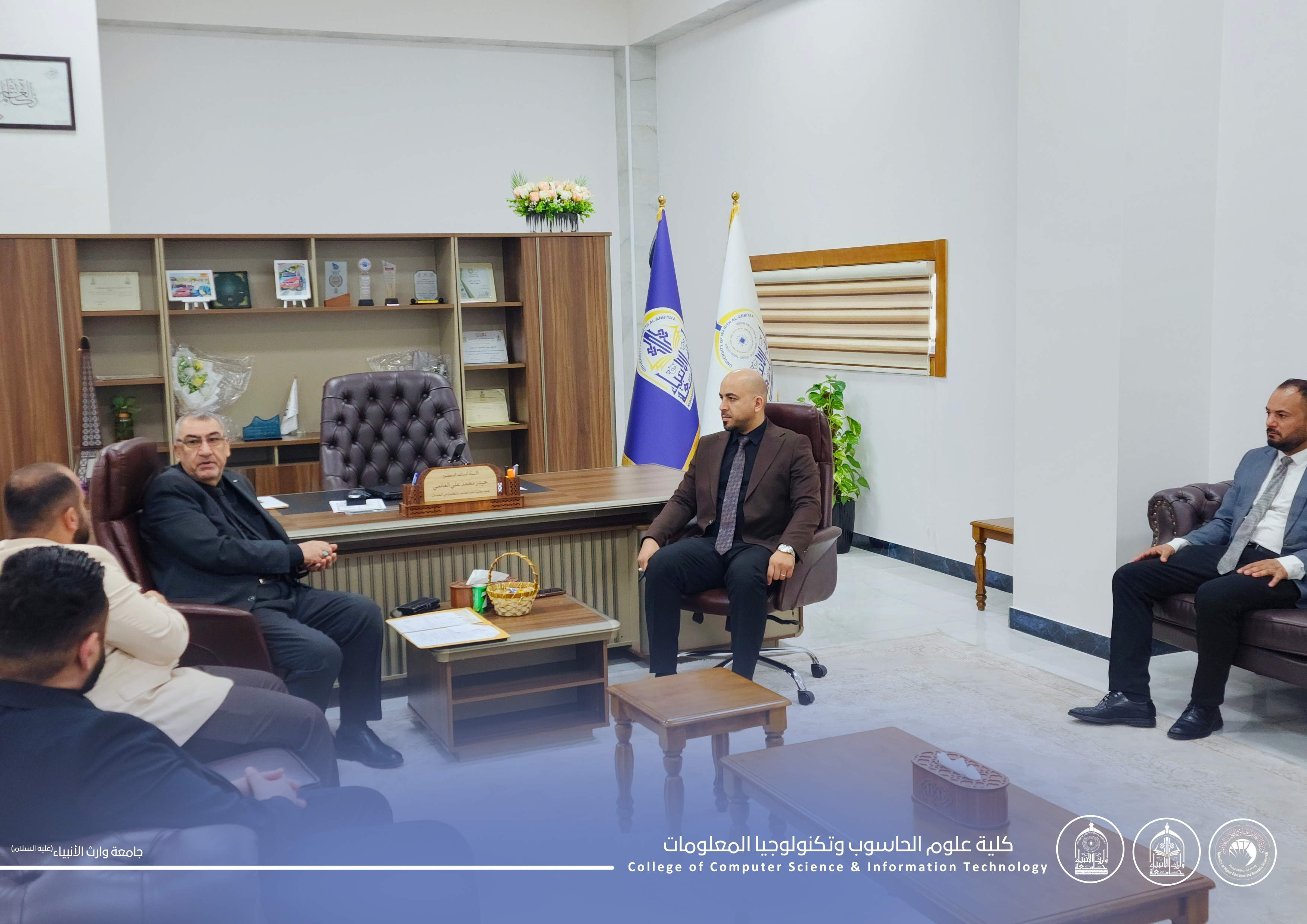 استقبل السيد عميد كلية علوم الحاسوب وتكنولوجيا المعلومات، الأستاذ المساعد الدكتور حيدر محمد علي الغانمي، وفداً رفيع المستوى من كلية الهندسة - جامعة وارث الانبياء- برئاسة السيد العميد الأستاذ المساعد الدكتور حسين هادي حسين، يرافقه نخبة من أساتذة الكلية.