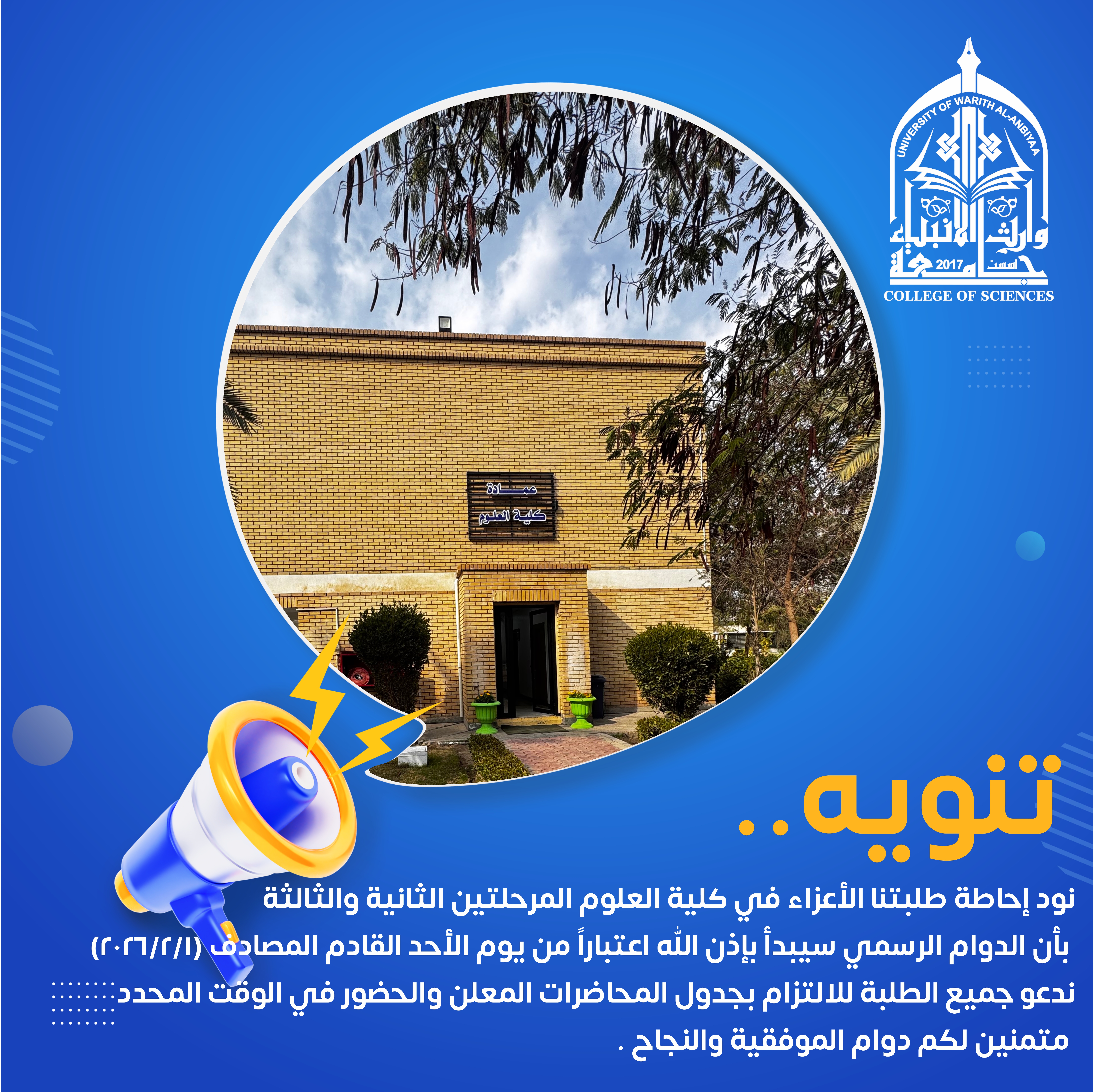 نود إحاطة طلبتنا الأعزاء في كلية العلوم المرحلتين الثانية والثالثة، بأن الدوام الرسمي سيبدأ بإذن الله اعتباراً من يوم الأحد القادم المصادف (٢٠٢٦/٢/١)