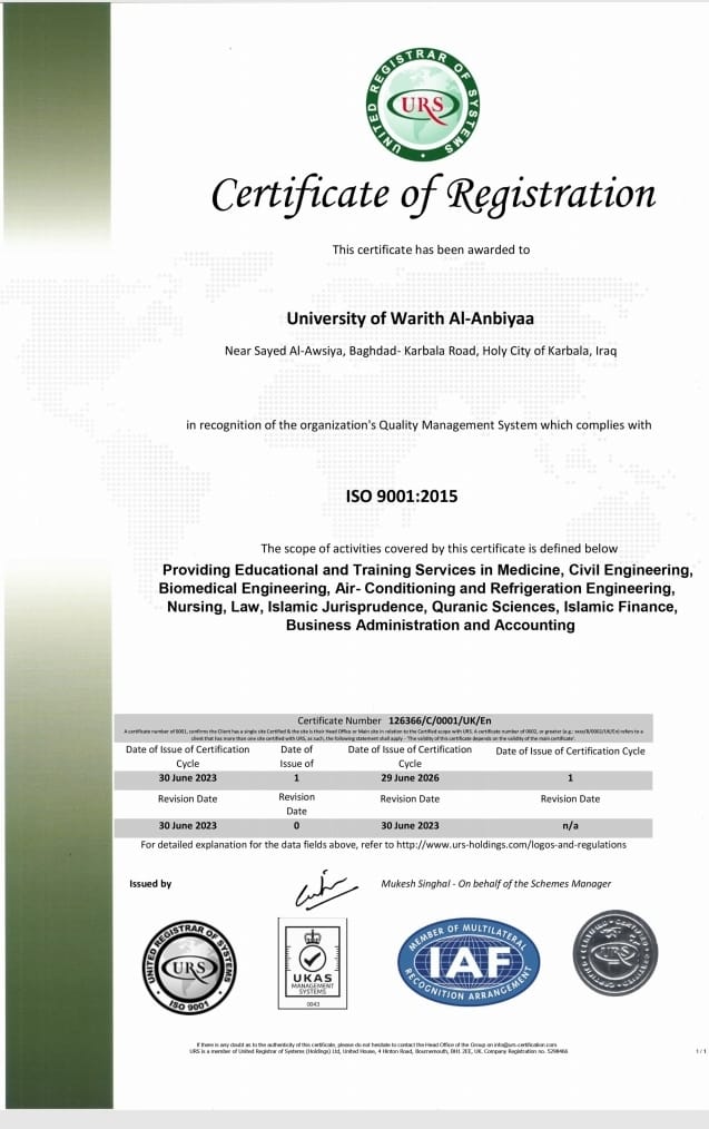 حصدت جامعة وارث الأنبياء(عليه السلام)، على ثلاث اعتمادات دولية مهمة في ادارة الجودة ISO 9001 والبيئة ISO 14001 والسلامة المهنية ISO 45001 من "المؤسسة الدولية البريطانية للاعتماد UKAS" بعد جهود متواصلة امتدت لاكثر من 10 أشهر من التدريب والتأهيل والتدقيق.