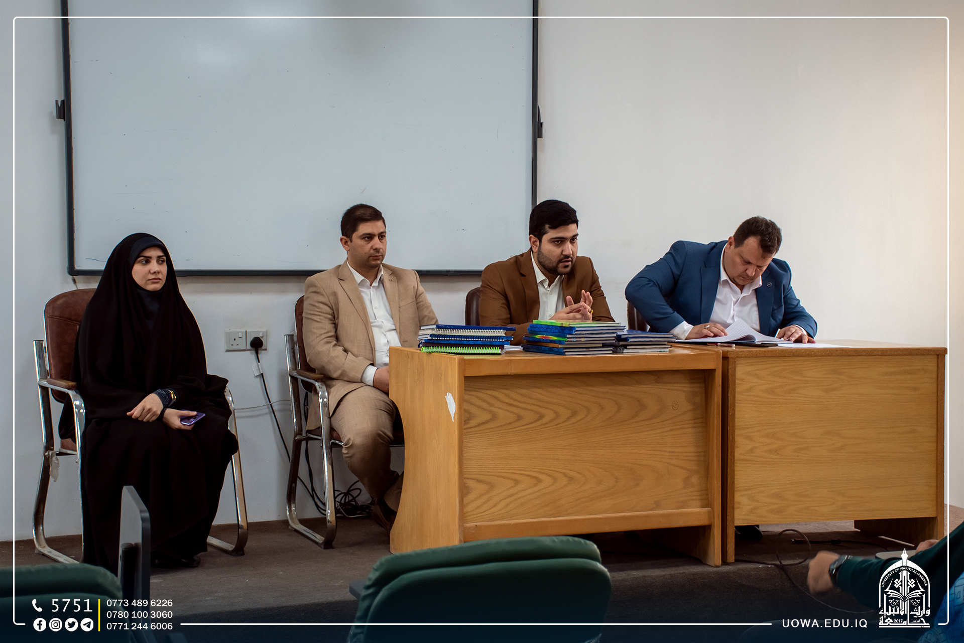 جانب مصور من مناقشة سجلات التدريب الصيفي لطلبة المرحلة الرابعة، ضمن متطلبات التخرج لطلبة كلية القانون في جامعة وارث الانبياء (عليه السلام).
