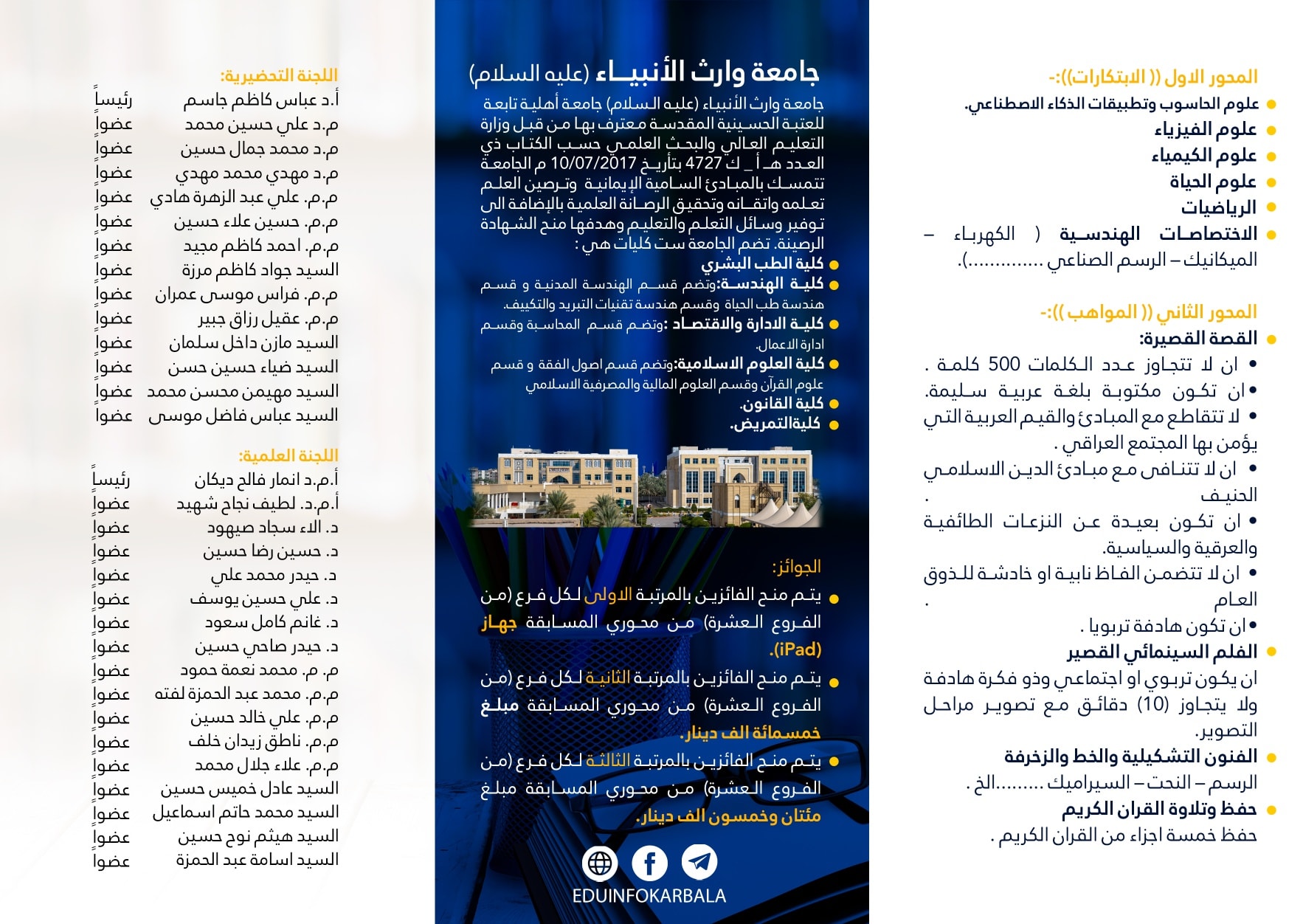 اطلقت جامعة وارث الانبياء(عليه السلام) وبالتعاون مع مديرية تربية محافظة كربلاء المقدسة "جائزة وارث الأنبياء للمبدعين والموهوبين من طلاب المدارس الثانوية".