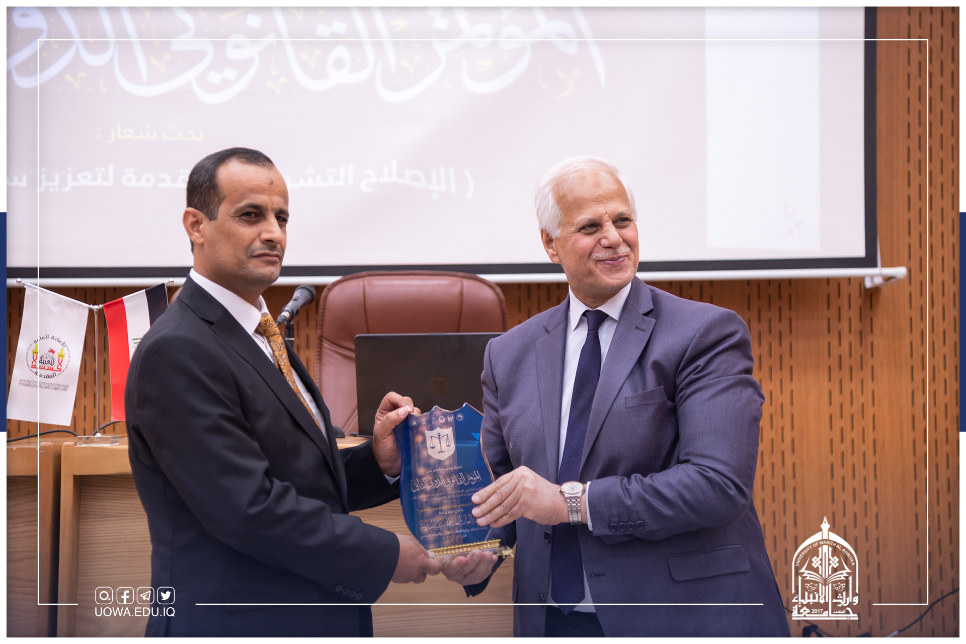المؤتمر القانوني الدولي الثاني تحت شعار "الإصلاح التشريعي مقدمة لبناء الدولة القانونية" ينعقد المؤتمر في رحاب جامعة وارث الأنبياء (عليه السلام) بتأريخ 20-7-2022