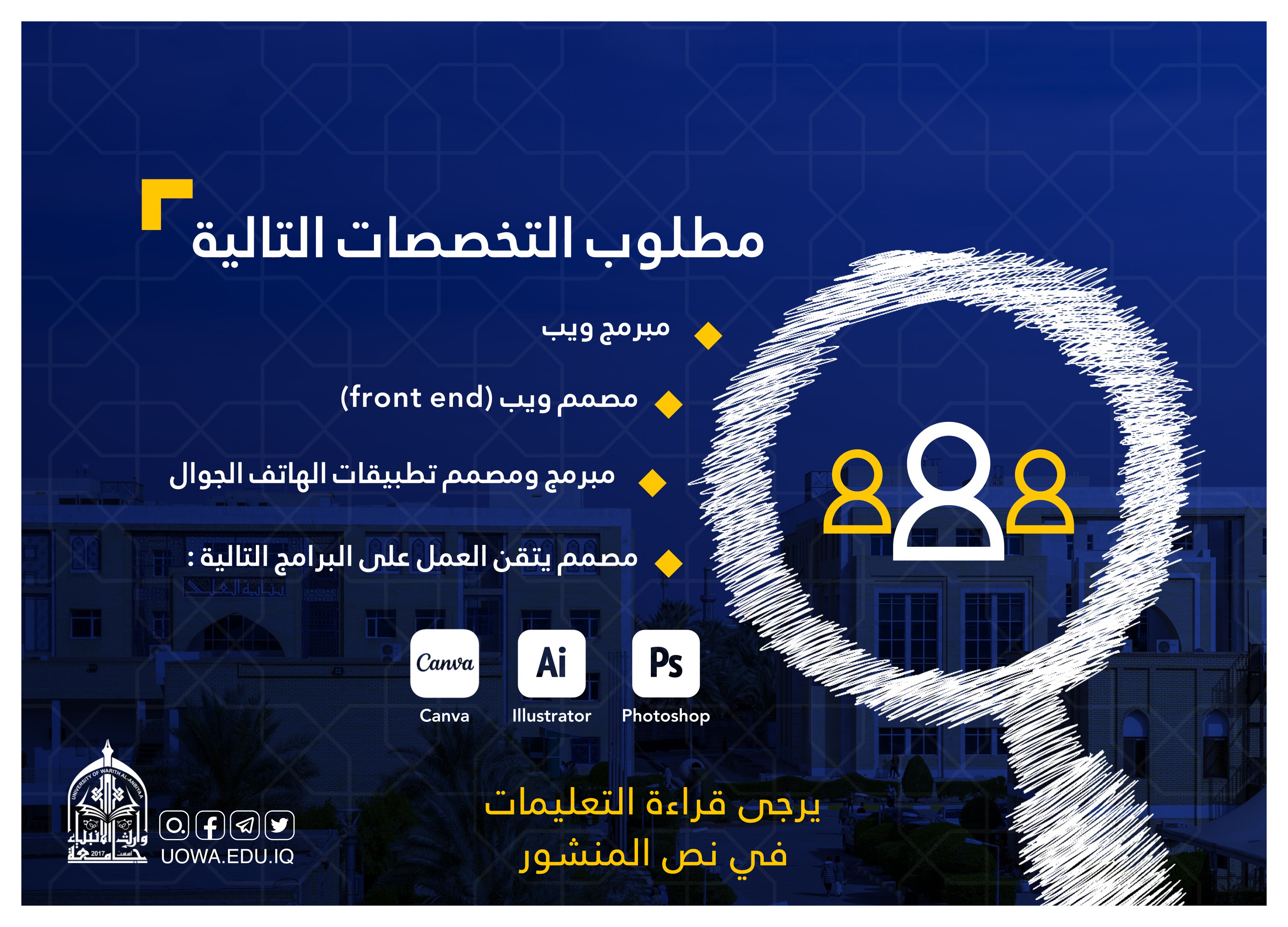 تعلن جامعة وارث الانبياء(عليه السلام) عن حاجتها الى درجات وظيفية للعمل في مركز الحاسبة الالكترونية.عند التقديم يرجى ذكر الفقرات الاتية: 1. الاسم الرباعي للمتقدم2. يعمل حالياً أو لا مع ذكر مكان العمل 3. تقديم (cv) بصيغة ملف pdf4. التخصص ونسخة من شهادة الاختصاص5. اذا كان المتقدم مختص بالتصميم يتم وضع روابط اعماله الموجودة على (behance, canvas, figma ) أو ارفاق مجموعة من تصاميمه على شكل صور.6. إذا كان المتقدم مختص بالبرمجة عليه وضع رابط( linkedin و github )وفي حال عدم توفرها، عليه ارسال روابط أعماله سواء كانت مواقع أو تطبيقاتعلى الراغب بالتقديم مراسلة بريد مركز الحاسبة الالكترونية في الجامعة [email protected]