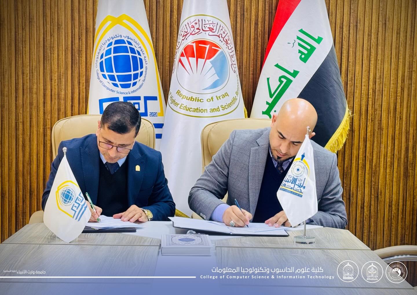 As part of strengthening academic cooperation and the exchange of scientific expertise, Assistant Professor Dr. Haider Mohammed Ali Al-Ghanmi, Dean of the College of Computer Science and Information Technology at the University of Warith Al-Anbiyaa (peace be upon him), signed a scientific twinning agreement with Assistant Professor Dr. Muwaffaq Kazem Al-Hassnawi, Dean of the College of Computer Science and Information Technology at the University of Karbala.