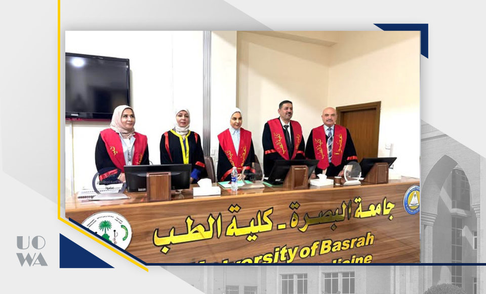 Professor Ali Abdul-Saadoun Al-Ghazi, Dean of the College of Medicine at the University of Warith Al-Anbiya, participated in chairing the discussion committee for a master's thesis at the College of Medicine, University of Basra, for researcher Zainab Abdul-Majid Awan. The thesis was titled: "Patient satisfaction with quality of health care services in public hospitals in Basrah city." The discussion took place in the Graduate Studies Hall of the College of Medicine, University of Basra, where the committee consisted of a select group of professors from Iraqi universities. This attendance comes within the framework of scientific and academic cooperation between Iraqi universities and to promote the mission of science, knowledge, and community service.